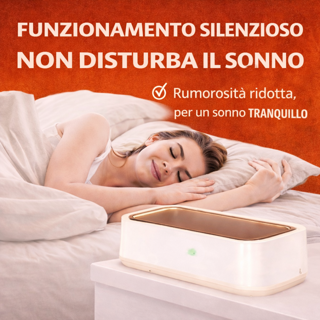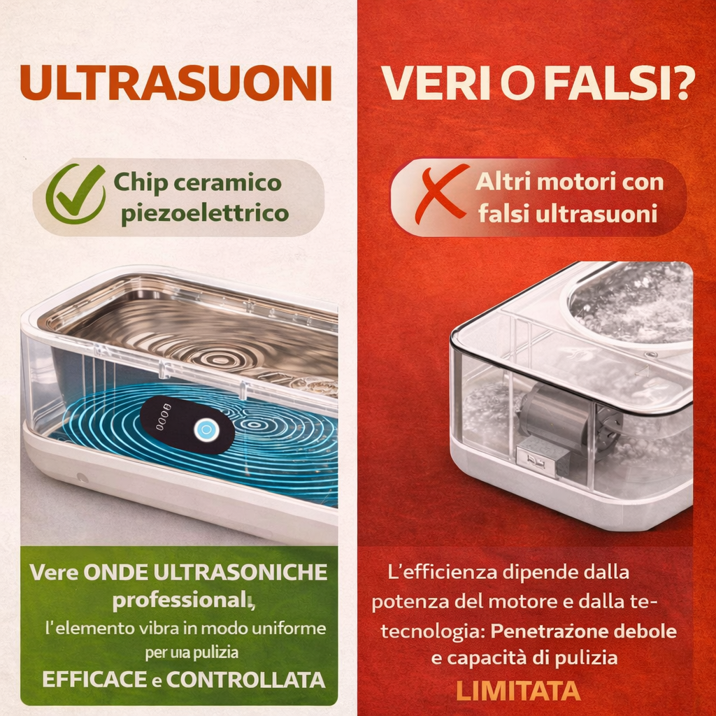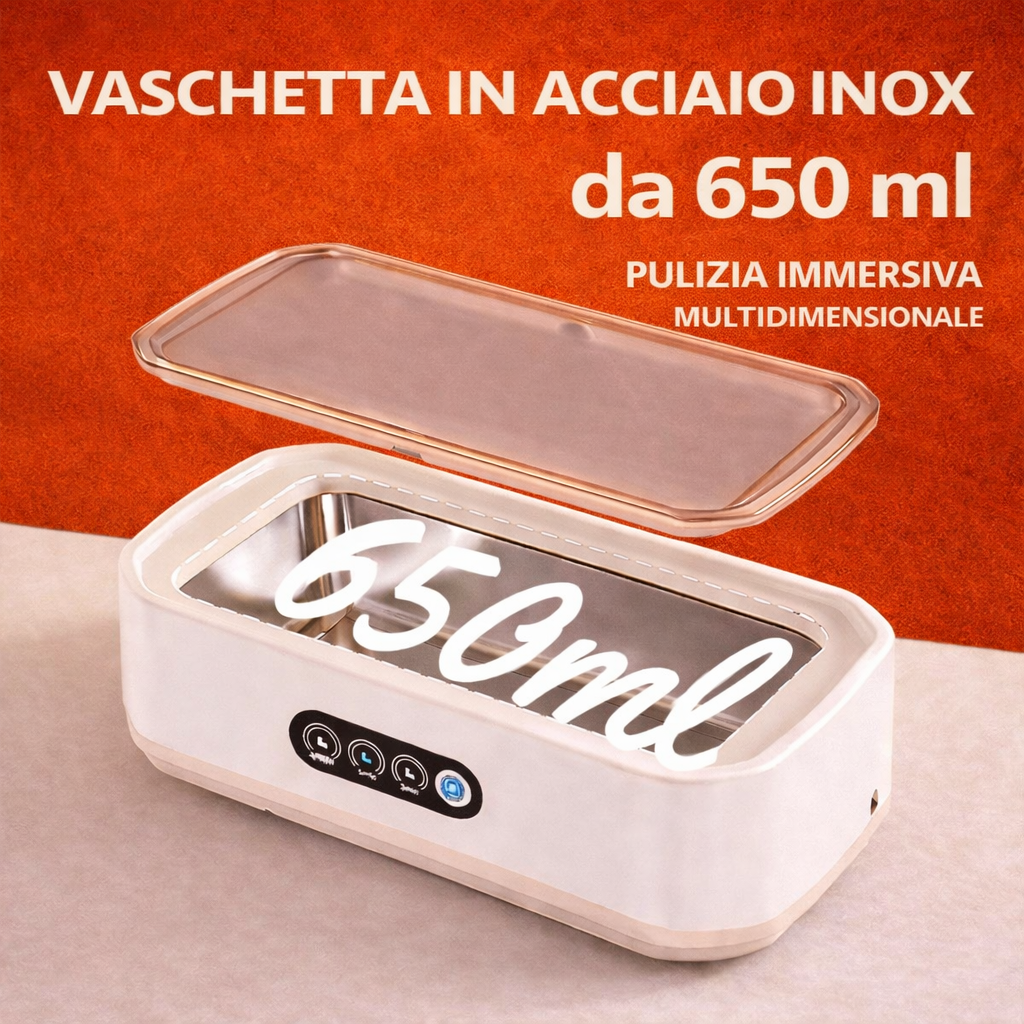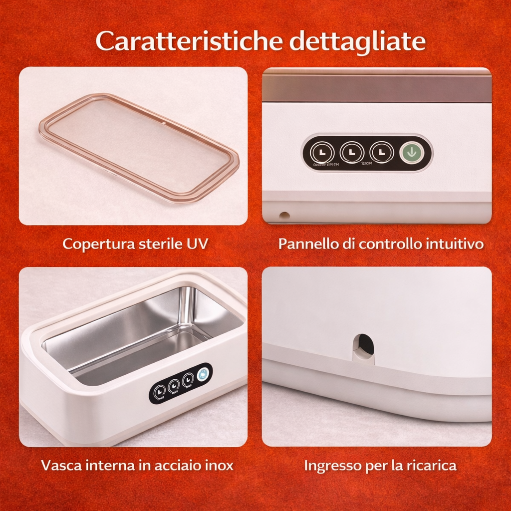 È semplicissimo: riempi la vaschetta con acqua, inserisci l’oggetto e premi il pulsante. In pochi minuti sarà perfettamente pulito, senza bisogno di strofinare